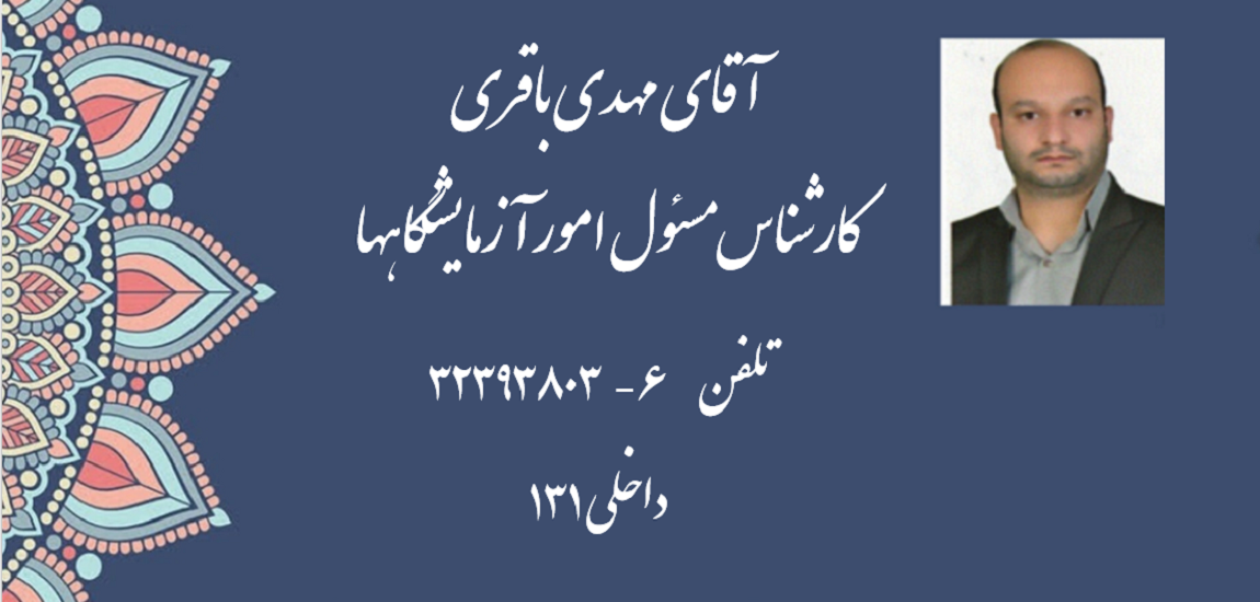کارشناس مسئول آزمایشگاه تعداد بازدید:۳۳۵۹ ارسال به دیگران نام شما ایمیل شما ایمیل دریافتکننده ارسال انصراف ایمیل: bagherimehdi60@yahoo.com محل استقرار: معاونت درمان دانشگاه علوم پزشکی و خدمات بهداشتی درمانی شاهرود واقع در ساختمان البرز- اتاق 202- شماره تماس 06- 32393803 داخلی 131واحد اداره امور آزمایشگاهها