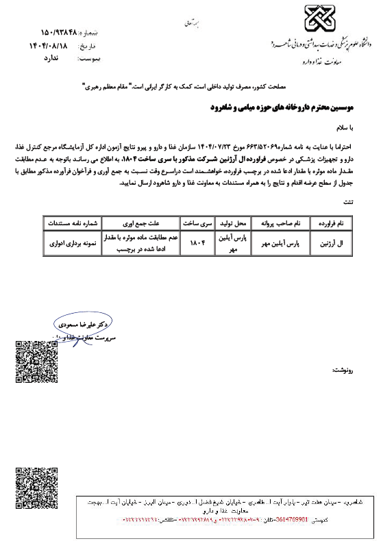 اطلاعیه فراخوان فرآورده اِل آرژنین برند دکترسان تولید شرکت پارس آیلین مهر