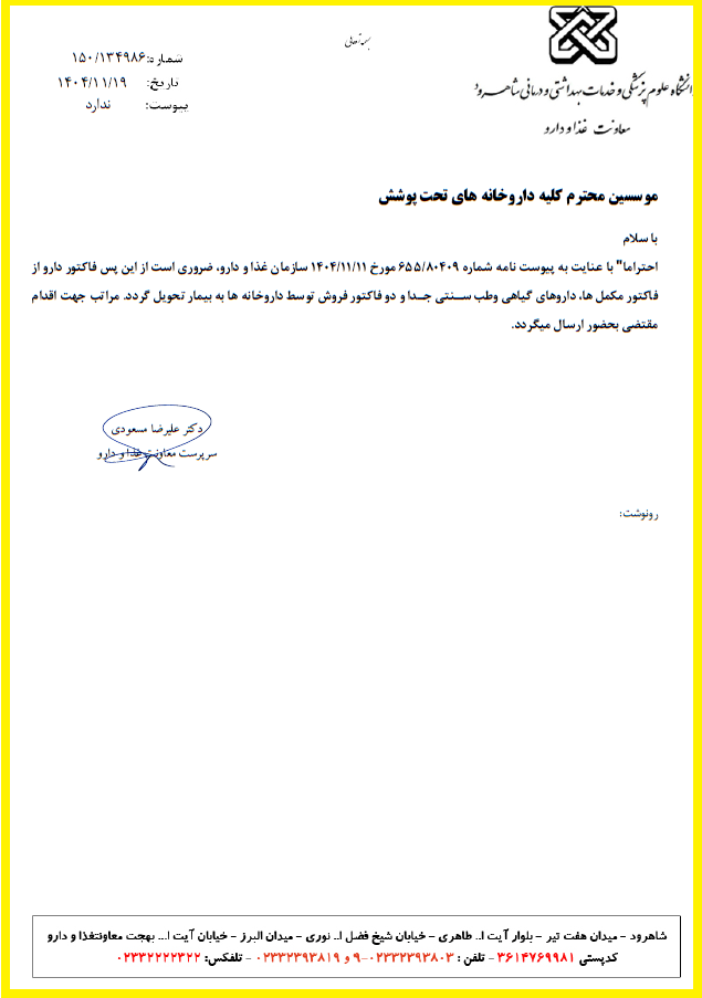 بر اساس مکاتبات مستمر سازمان غذا و دارو مبنی بر تفکیک فاکتورهای دارو از مکمل ها، داروهای گیاهی و طب سنتی نسبت به اجرایی نمودن این امر تاکید نمود.