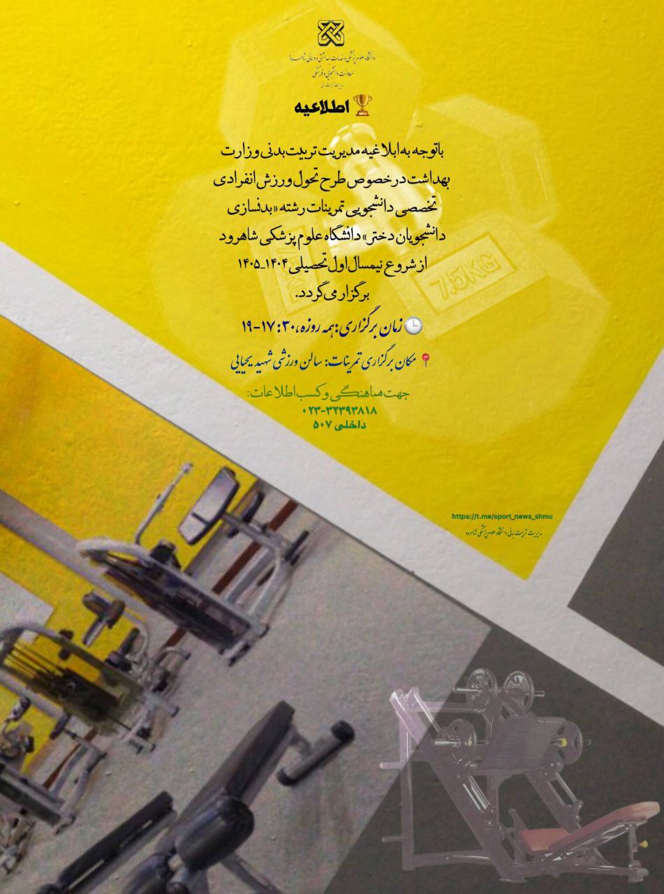 طرح تحول ورزش انفرادی تخصصی دانشجویان دختردررشته بدنسازی ۰۳ دی ۱۴۰۴ | ۱۱:۲۹ کد : ۲۲۴۹۵ تربیت بدنی ارسال به دیگران نام شما ایمیل شما ایمیل دریافتکننده ارسال انصراف تعداد بازدید:۲