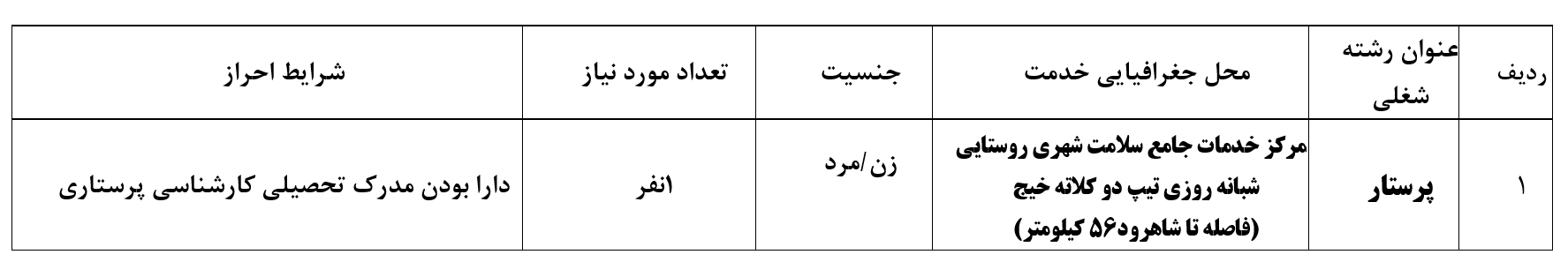فراخوان جذب پرستار کلاته خیج در قالب برنامه پزشک خانواده و بیمه روستایی