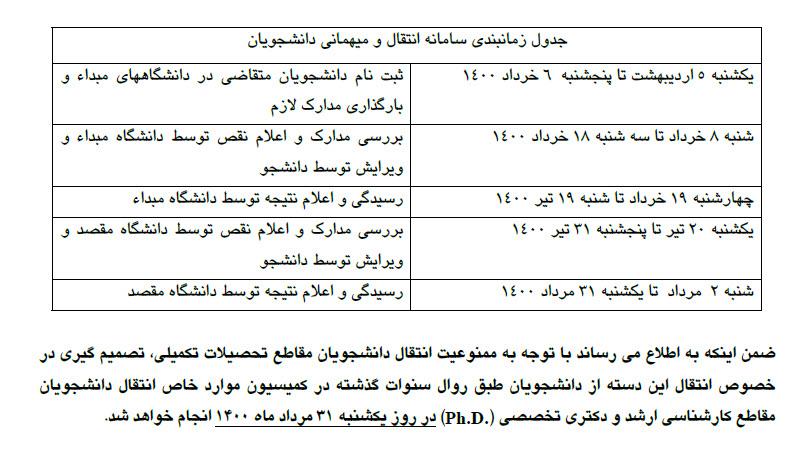 دانشجویان عزیز می توانند براساس جدول پیوست نسبت به ثبت درخواست مهمانی و انتقال برای ترم آینده اقدام نمایند.