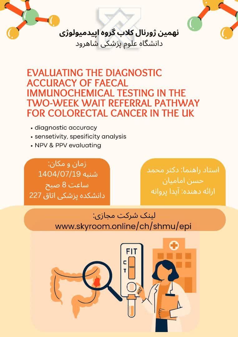 | ۱۷ | ۱۹/۷/۱۴۰۴ | آیدا پروانه | دکتر محمد حسن امامیان | نهمین جلسه ژورنال کلاب | Evaluation the diagnostic accuracy of fecal immunochemical testing in the two week wait referral pathway for colorectal cancer in the UK | ![]() |