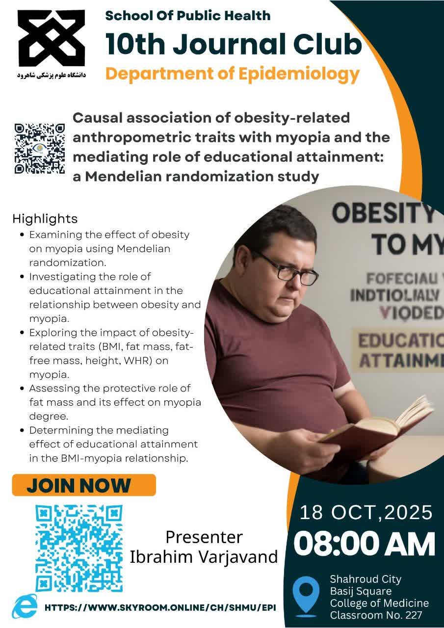| ۱۸ | ۱۴۰۴/۷/۲۶ | ابراهیم ورجاوند | دکتر احمد خسروی | دهمین جلسه ژورنال کلاب | Causal association of obesity-related anthropometric traits with myopia and the mediating role of educational attainment: a Mendelian randomization study | ![]() |